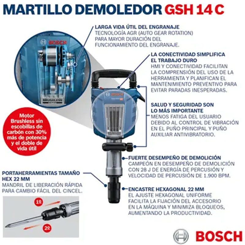 El martillo demoledor Bosch GSH 16-28 (modelo 06113350E0) es una herramienta profesional diseñada para trabajos intensivos de demolición y extracción de material en hormigón, piedra u otros sustratos duros. Con un motor potente de 1750 W y una energía de impacto de aproximadamente 41 J, este equipo ofrece una productividad extraordinaria, capaz de remover grandes volúmenes de material con rapidez y eficiencia. El diseño robusto y resistente incorpora un sistema de control de vibraciones (Vibration Control) que reduce el esfuerzo en las manos y brazos, lo que incrementa la comodidad y la productividad en jornadas largas. Su encastre hexagonal de 28 mm garantiza compatibilidad con una amplia gama de puntas y accesorios estándar, mientras que el maletín con ruedas facilita su transporte y almacenamiento en obra o taller. Este martillo es ideal para uso industrial o profesional pesado, combinando potencia, durabilidad y manejo ergonómico en una sola herramienta.