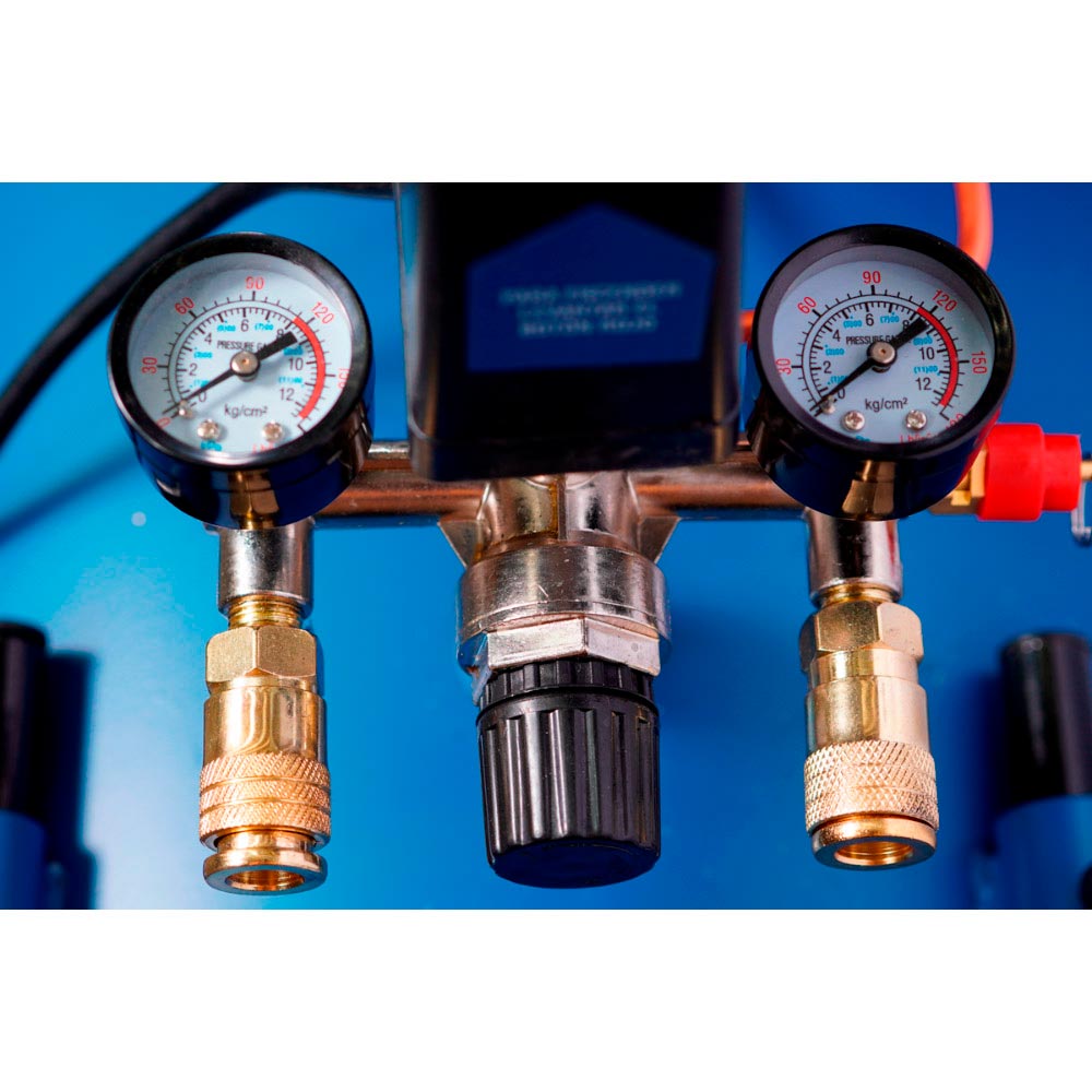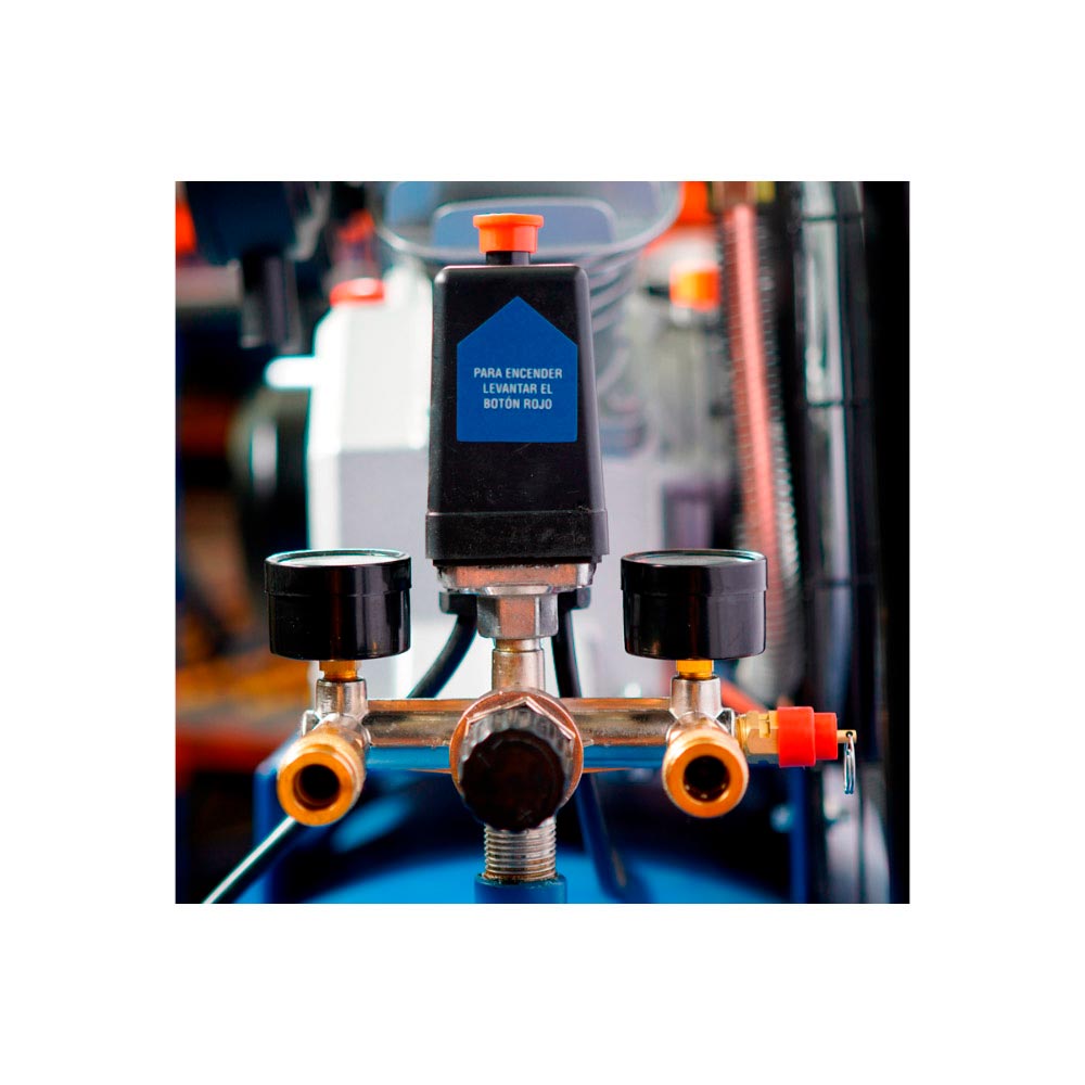 El compresor cuenta con caudal mínimo de 21,5 cfm (≈605 L/min a 90 PSI), lo que asegura un flujo de aire potente para aplicaciones exigentes. Su transmisión por correa ayuda a reducir vibraciones y ruido, prolongando la vida útil del motor y proporcionando un funcionamiento más suave. Además, incluye protección por sobretemperatura, regulador de presión montado sobre el tanque, presostato con arranque/parada automático y válvula de drenaje para un mantenimiento sencillo.