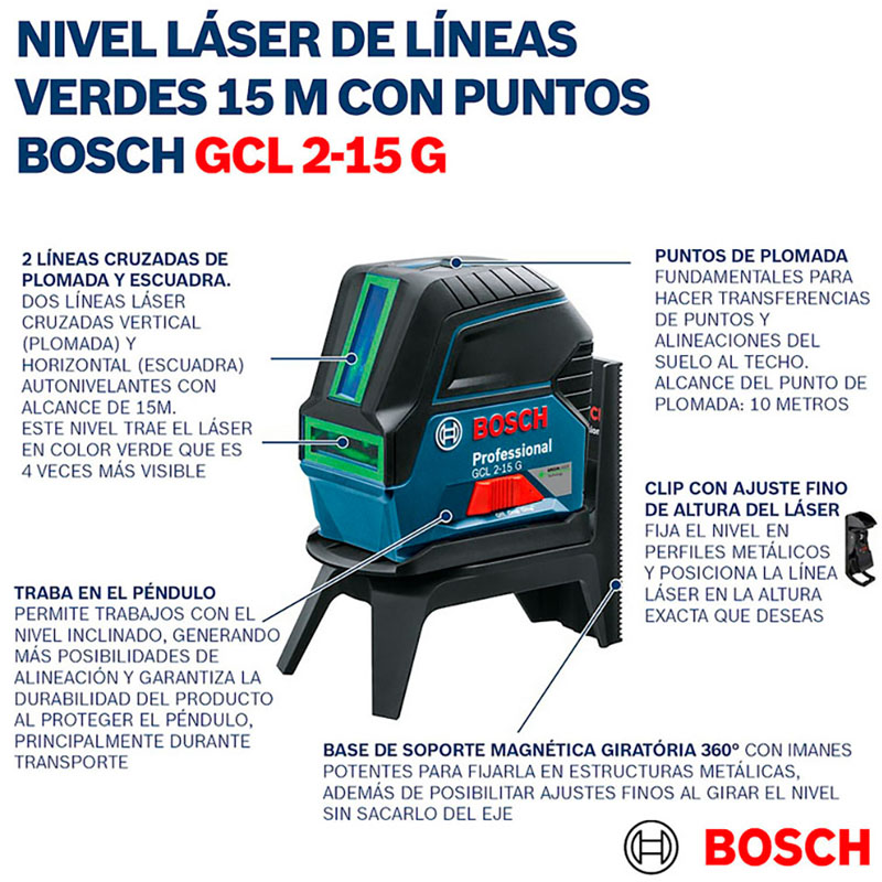El Nivel Láser Bosch GCL 2-15 G destaca como una herramienta versátil y potente para proyectos de construcción, instalación y terminaciones interiores. Gracias a sus líneas láser verdes, ofrece hasta cuatro veces más visibilidad que los láseres rojos tradicionales, facilitando lecturas nítidas incluso en espacios iluminados. Proyecta dos líneas (horizontal y vertical) y dos puntos de plomada que permiten realizar alineaciones precisas desde el techo al piso, eliminando la necesidad de marcas manuales. Su sistema de autonivelación rápido y preciso garantiza líneas perfectamente niveladas en segundos, mientras que la construcción robusta con protección IP54 lo hace resistente al polvo y salpicaduras en obras exigentes. Ligero, fácil de usar y con excelente duración de batería, es la herramienta ideal tanto para profesionales como para aficionados exigentes.
