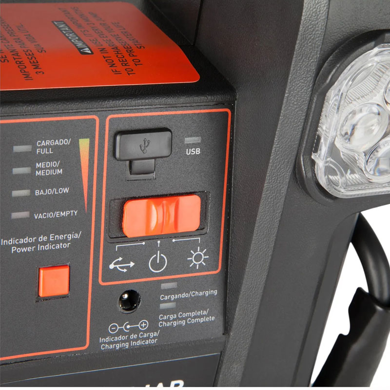 Su batería interna sellada ofrece un desempeño estable y seguro, mientras que sus resistentes pinzas y cables de alta calidad garantizan una conexión firme y eficiente. Incorpora luz LED integrada, perfecta para situaciones nocturnas o de baja visibilidad, y un práctico puerto USB que permite cargar dispositivos móviles cuando más lo necesitas. Además, incluye cargador para mantener el equipo siempre listo para usar.