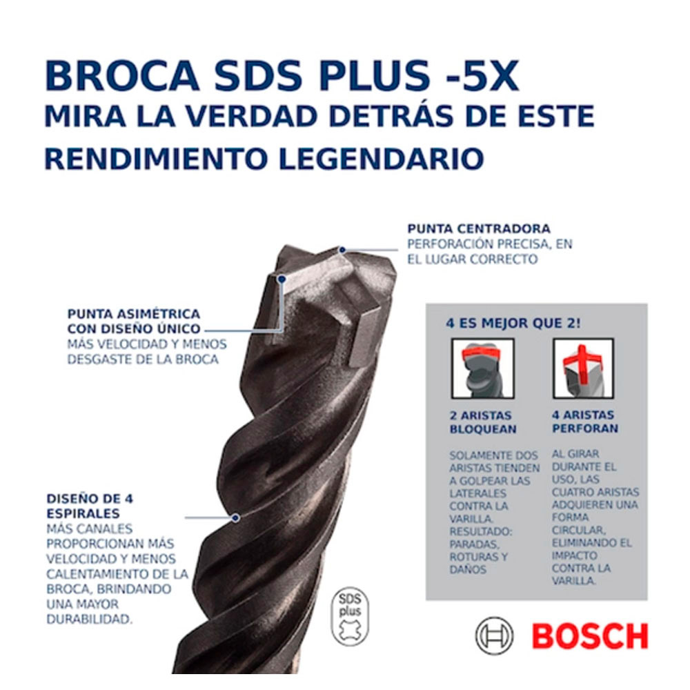 La broca Bosch SDS Plus-5X de 13×200×260 mm es una broca de alto rendimiento diseñada para trabajos exigentes en hormigón, mampostería, piedra y especialmente concreto armado. Incorpora una cabeza de cuatro filos con pastillas de carburo de tungsteno, lo que le otorga una gran resistencia al desgaste y permite perforar materiales muy duros sin perder eficacia. Su punta centradora facilita un inicio preciso del taladro y ayuda a mantener la perforación recta, incluso en superficies irregulares.