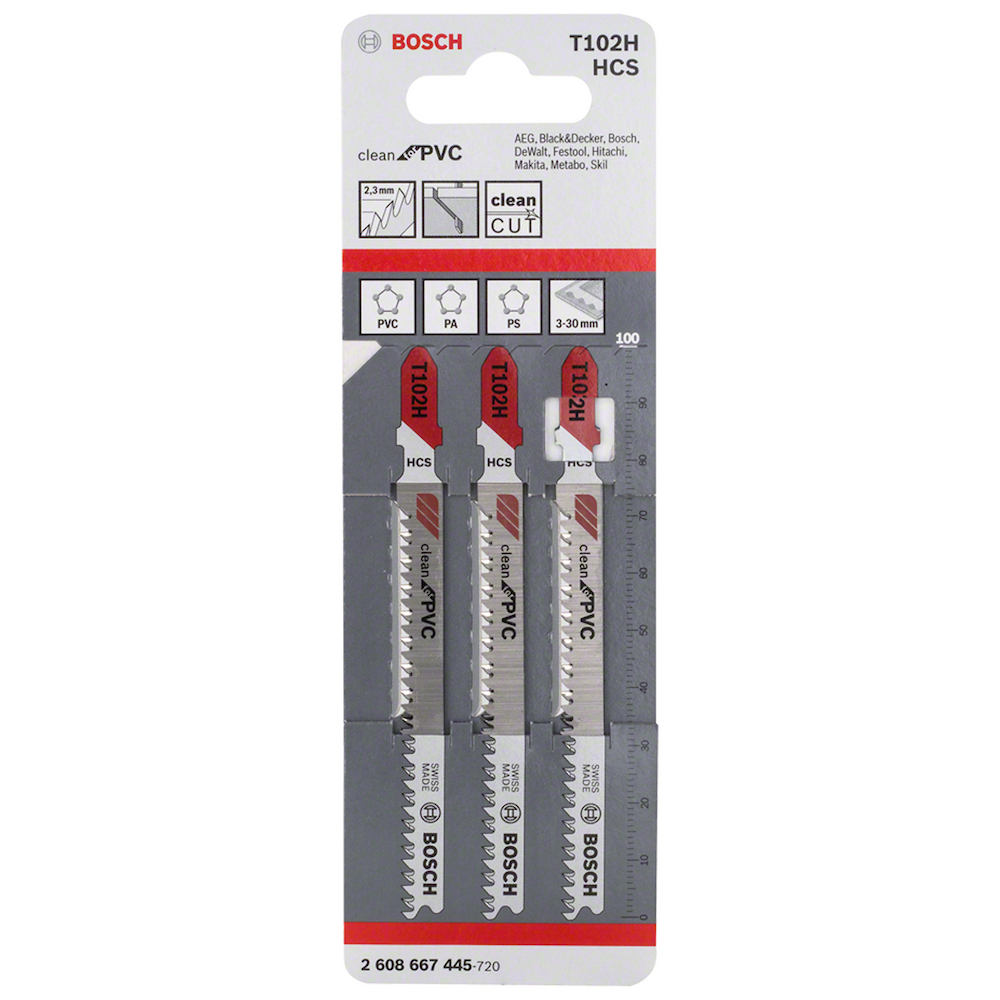 La hoja de sierra de calar Bosch T 102 H Clean for PVC está diseñada específicamente para realizar cortes rectos limpios en diversos materiales plásticos, como PVC, PA y PS.