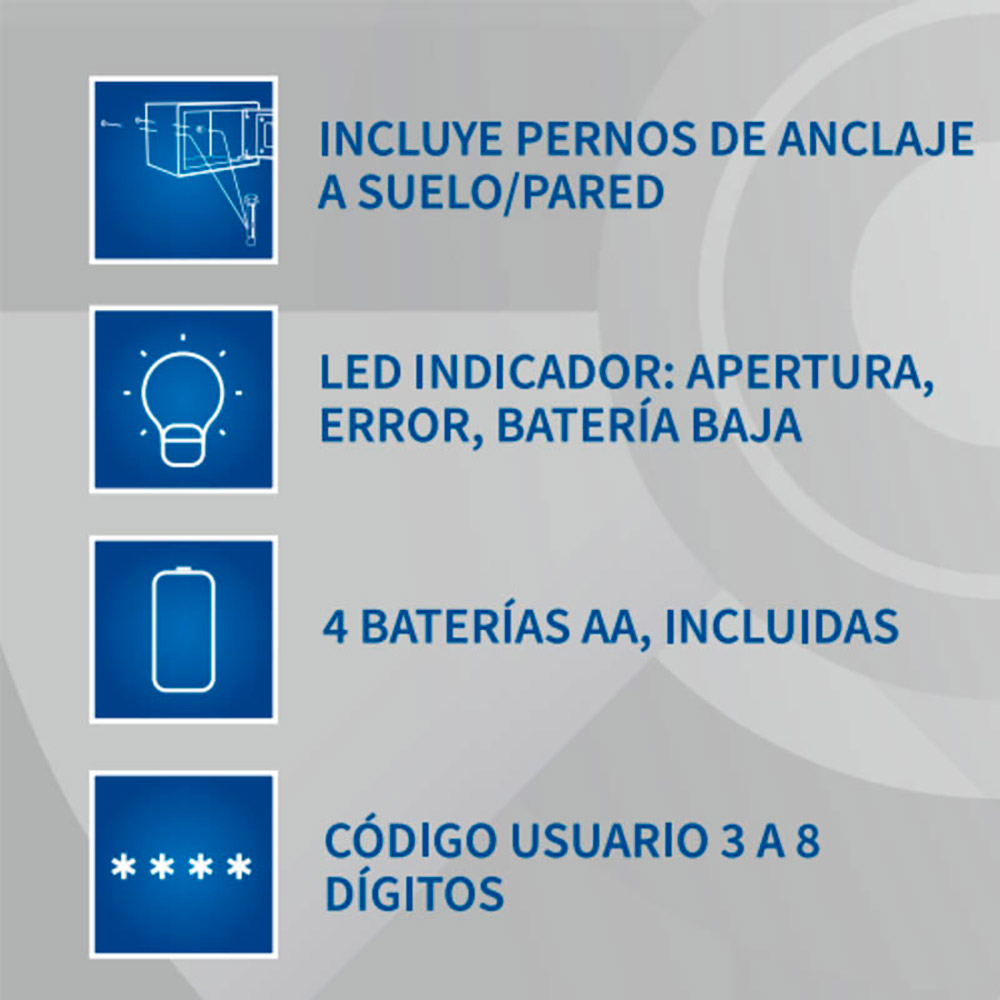 – Tipo de cierre: eléctrico y llave de emergencia. (incluye 2 llaves)