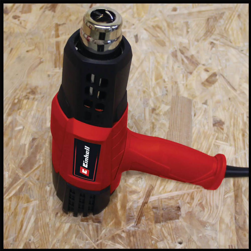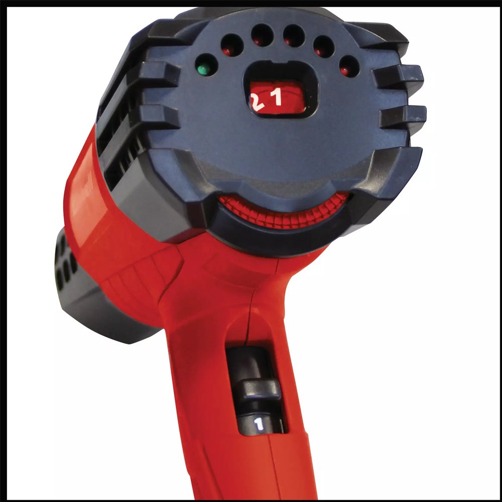 La pistola de aire caliente Einhell TE-HA 2000 E produce la temperatura correcta, ya sea para eliminar lacas y pinturas viejas, para colocar tubos de plástico o para calentar metal en trabajos de soldadura. Con una potencia de 2.000 W, esta pistola de aire caliente es una ayuda probada durante los distintos pasos de trabajo que requieren calor, ya sea a 50 o a 550 grados. Una gran rueda de ajuste permite regular la temperatura en nueve niveles diferentes, mientras que un interruptor de tres posiciones controla el caudal de aire necesario de 250 a 500 litros por minuto. Un ajuste adicional en frío permite enfriar rápidamente las piezas metálicas calientes para cambiar la boquilla. La pistola de aire caliente dispone de una superficie plana para su colocación segura durante el uso estacionario. Se suministran como accesorios estándar una boquilla reductora, una boquilla de chorro ancho, una boquilla reflectora y una boquilla de ventana para lograr la máxima versatilidad en todas las tareas.
