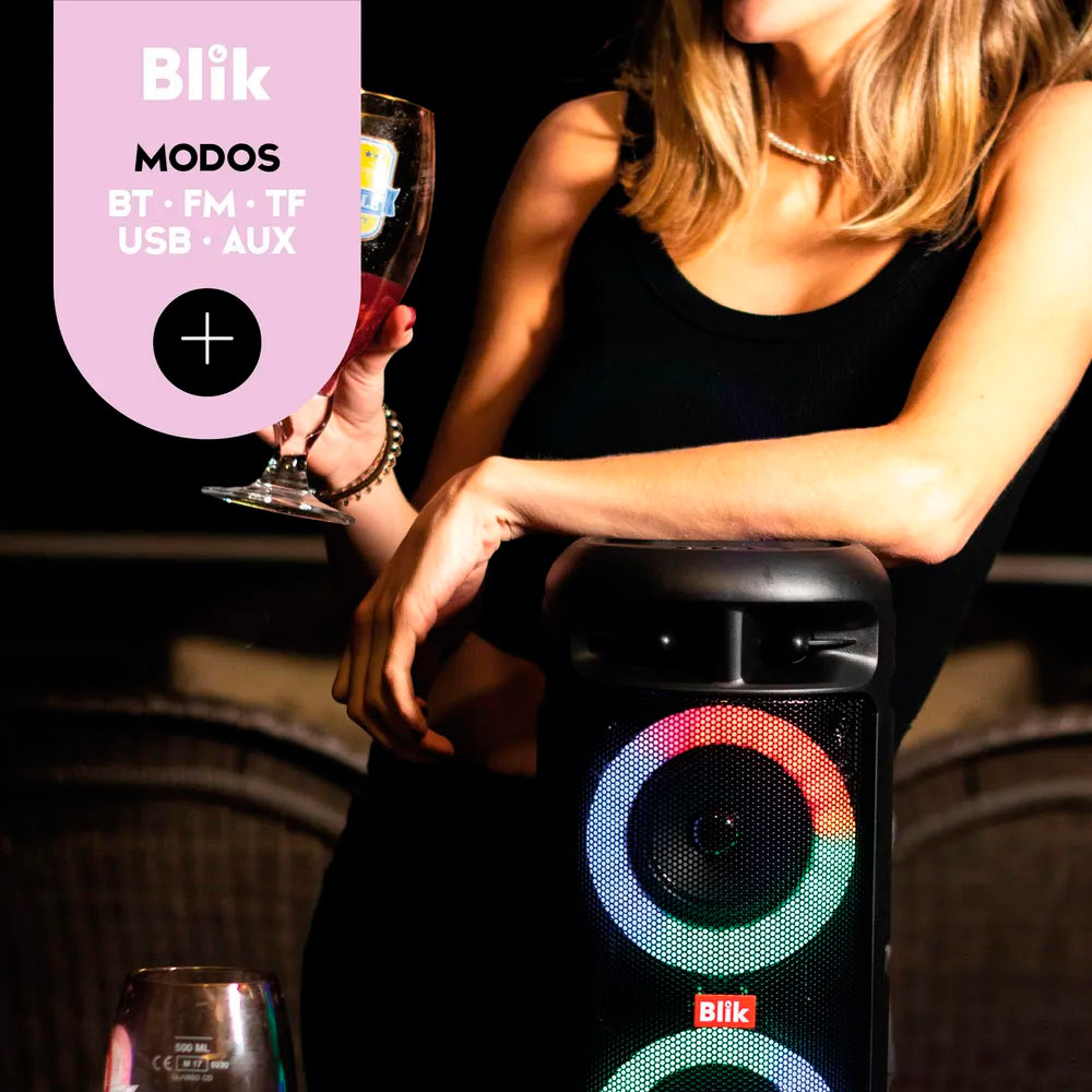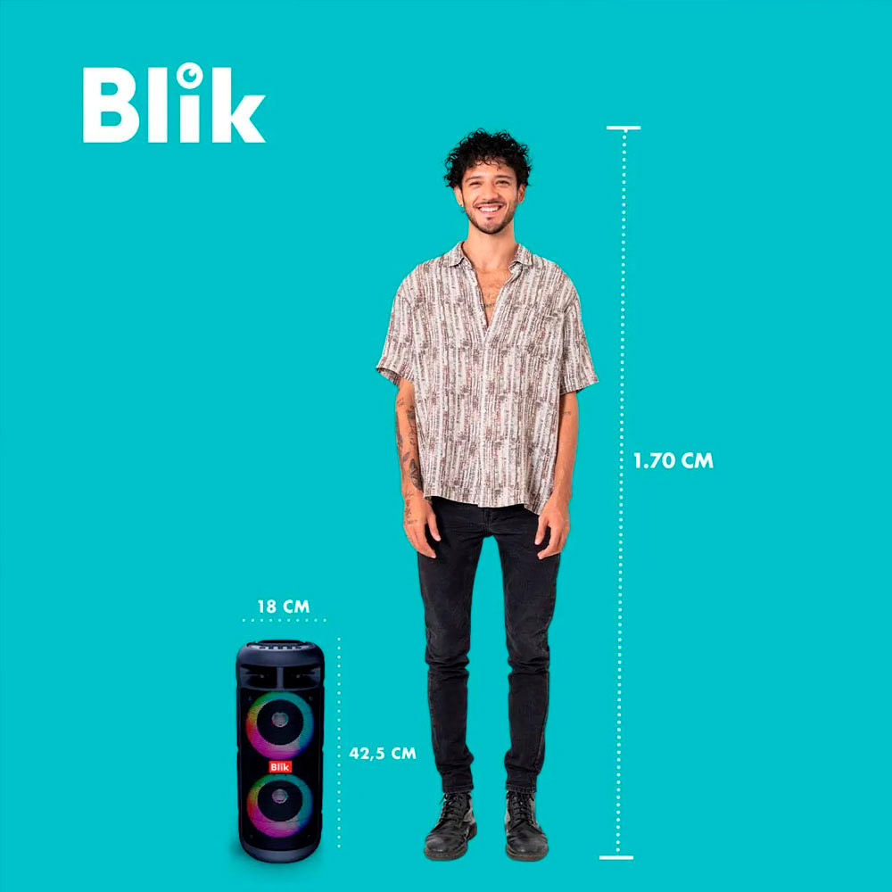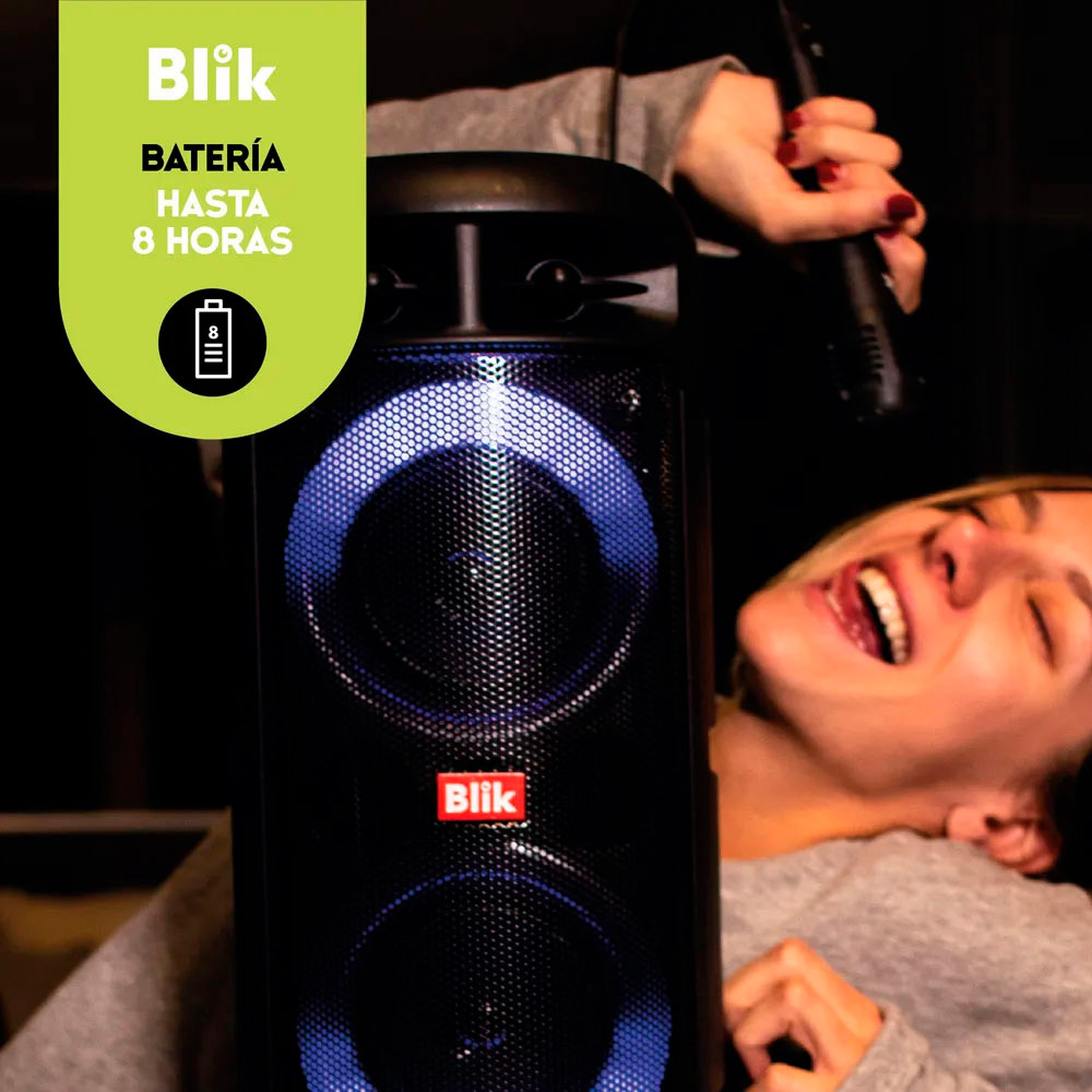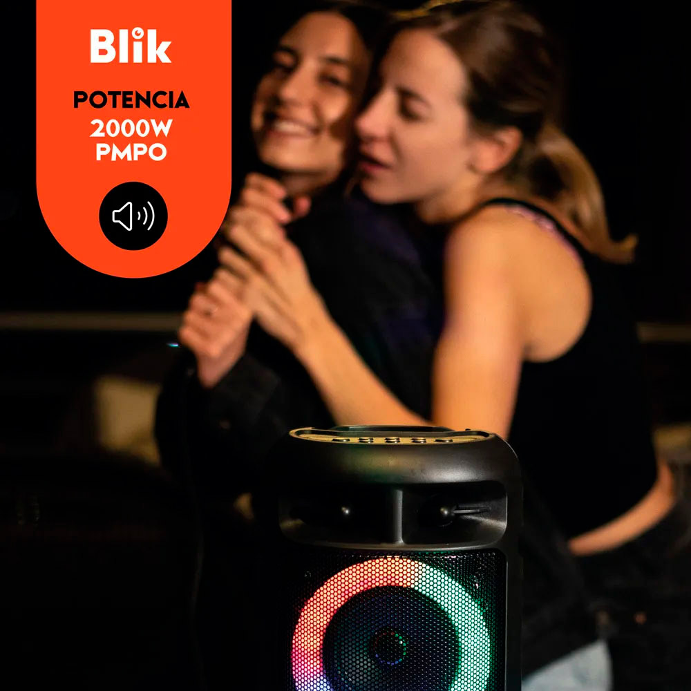 El Blik UpSound 3 es un parlante compacto con una potencia de 2000W PMPO. Incorpora luces RGB y viene con un micrófono alámbrico, ideal para llevar la diversión a cualquier lugar. Con una autonomía de hasta 4 horas de batería, permite disfrutar de la música continuamente. Gracias a su tecnología TWS, es posible conectar dos UpSound 3 y amplificar la experiencia sonora en estéreo.