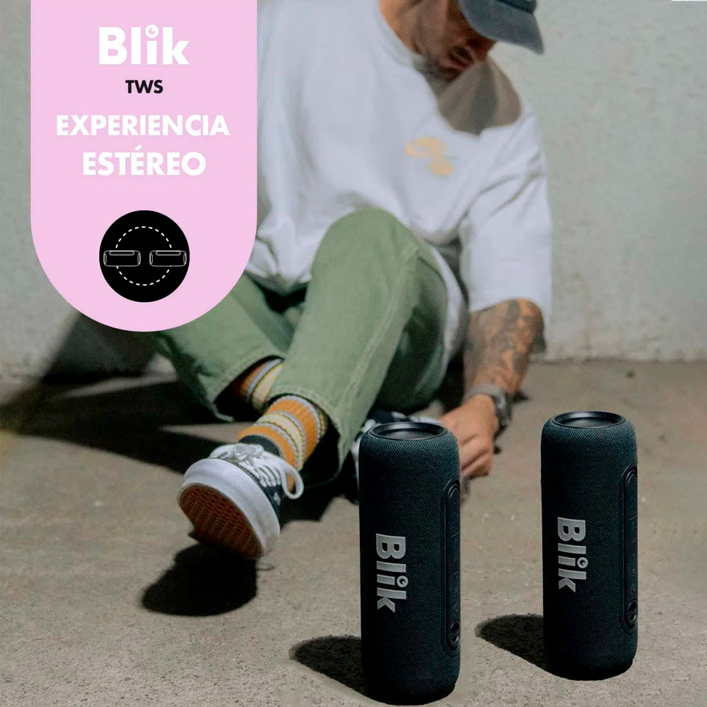 Con el Blik Live, experimenta cada melodía con claridad. Activa la reproducción y enriquece tus momentos con sonido puro, una duración de batería de 8 horas y luces de colores que capturan la atención en cualquier lugar. Además, conecta dos Blik Live simultáneamente para una experiencia estéreo envolvente.