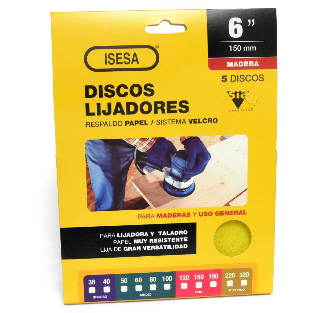 DISCO DE LIJA 6" GR 100 MADERA VELCRO DISPLAY 5 UND ISESA Mod: 765958 Disco de lija de 6 pulgadas con grado abrasivo 100, diseñado para un lijado medio-fino en superficies de madera. Su fijación tipo velcro permite una instalación rápida y segura, ideal para trabajos que requieren mayor precisión y uniformidad. Incluye 5 unidades en display, recomendado para aplicaciones profesionales en carpintería y terminaciones.