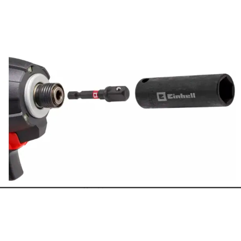 El juego de vasos se complementa con un robusto adaptador de vasos cuadrados de 3/8" a E 6,3, lo que permite utilizar los vasos largos incluidos en el juego de vasos en atornilladores a batería y pequeños atornilladores de impacto.