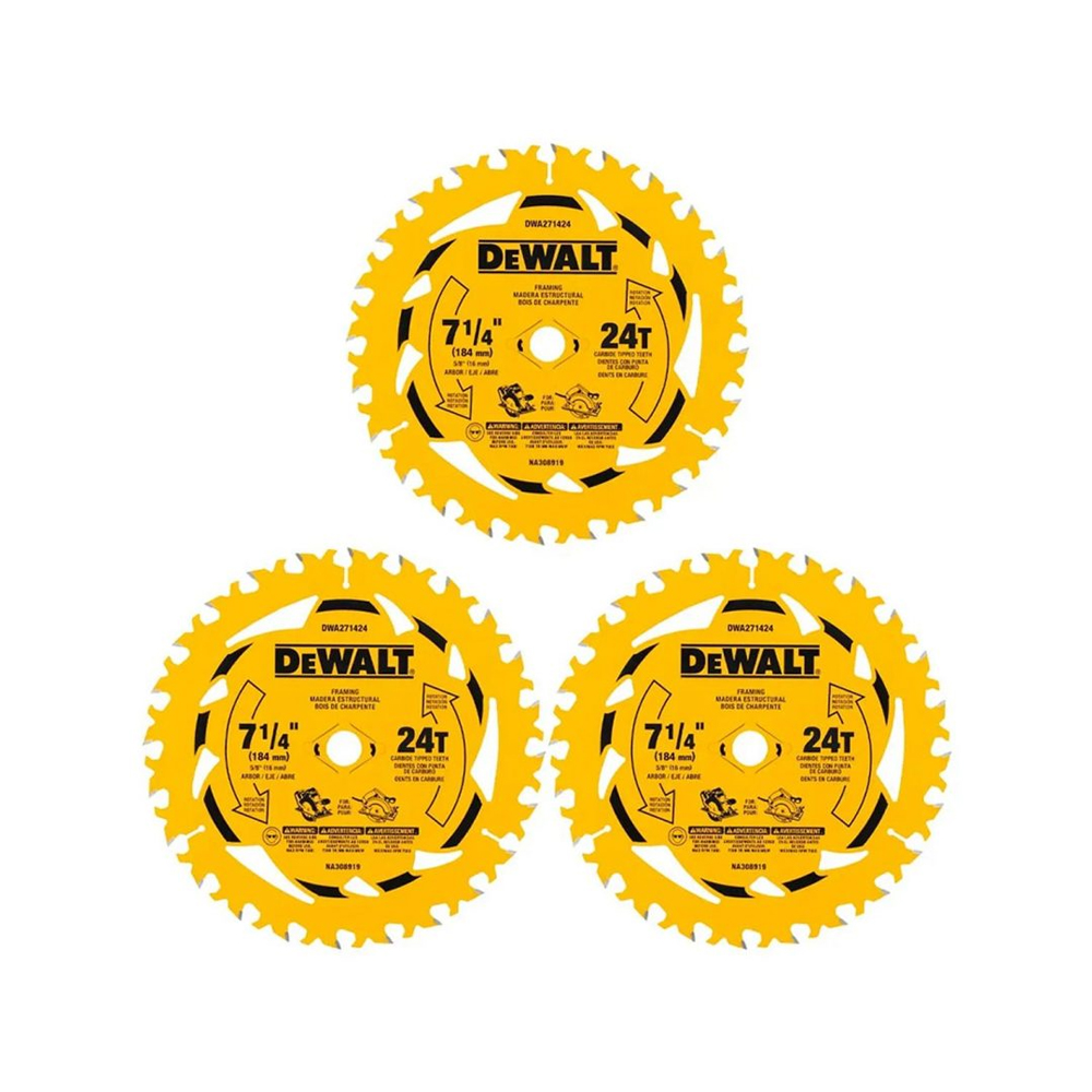 El Pack de 3 Discos de Sierra DeWALT de 7-1/4»x5/8» y 24 dientes es la herramienta ideal para tus proyectos de carpintería. Con un diámetro externo de 184 mm y un diámetro del agujero de 15.88 mm, estos discos están diseñados para ofrecer cortes precisos en madera. Su ancho de corte de 1,7 mm y el tipo de diente alterno positivo (ATB) garantizan un rendimiento excepcional y una calidad de corte superior. Fabricados con material de carburo de tungsteno, estos discos son duraderos y resistentes al desgaste. Con una velocidad máxima de 7.000 RPM, son perfectos para trabajos exigentes. Además, su color amarillo distintivo y la marca DeWALT aseguran que estás utilizando un producto de alta calidad. Recuerda seguir las instrucciones de instalación y verificar la dirección de giro para un uso seguro y eficiente.