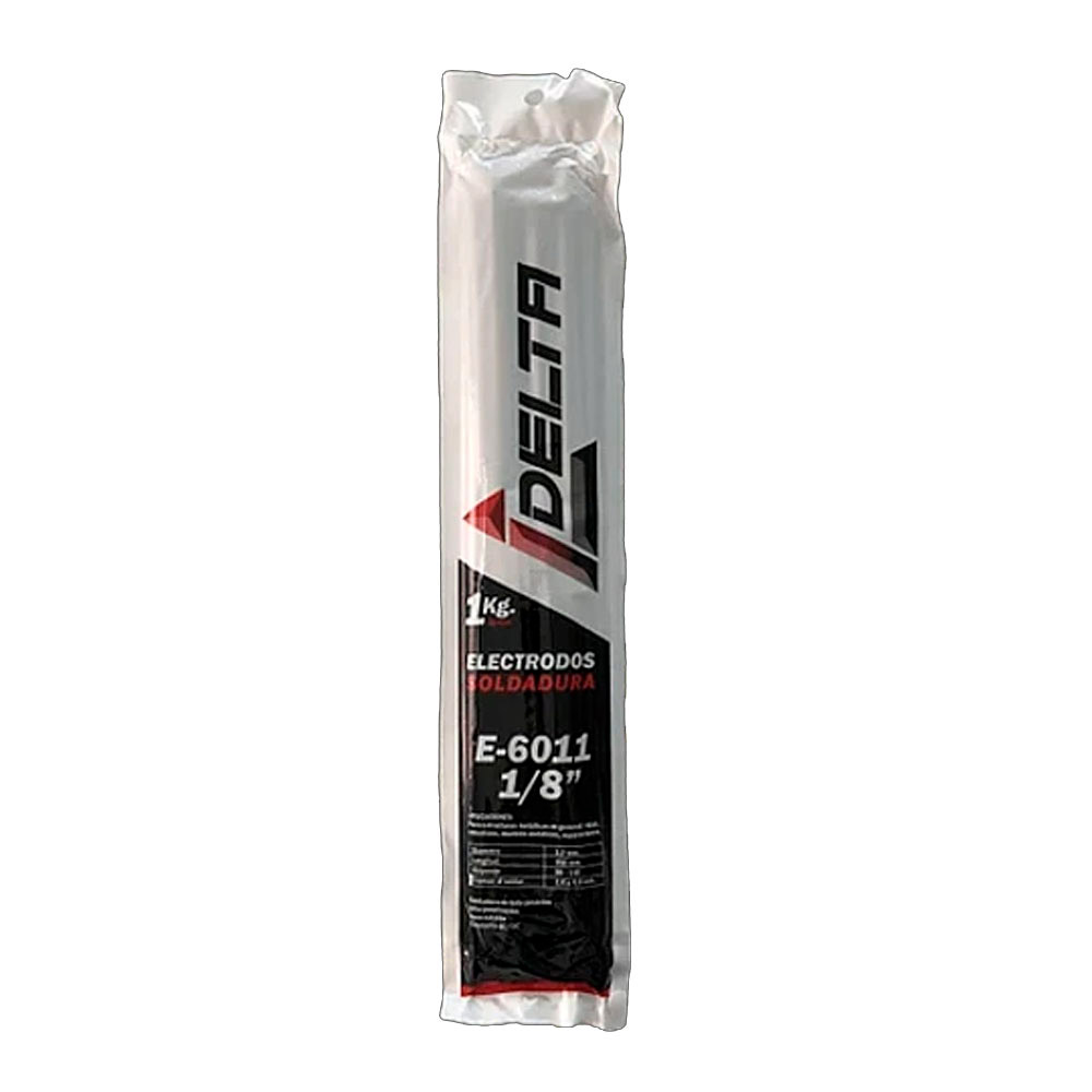 Los Electrodos DELTA 1/8" E-6011, corresponde al grupo de los accesorios de maquinarias y se trata de un producto de ferretería para soldadura al arco. Es un elemento que combina las funciones de electrodo y fundente ya que parte de su material se incorpora a la aleación que resulta del trabajo de soldadura. Se utiliza en trabajos de cerrajería, en estructuras livianas de acero al carbono y en muebles metálicos, etc. Presentación en envases de 1 KG .