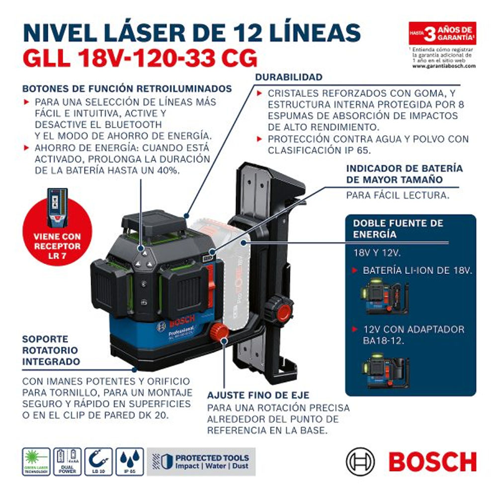 El nivel láser 360º lineal Bosch GLL 18V-120-33 CG es una herramienta profesional diseñada para ofrecer máxima precisión, alcance y durabilidad en trabajos de construcción e instalaciones. Proyecta tres líneas láser de 360° —una horizontal y dos verticales— que permiten nivelar y alinear una habitación completa sin necesidad de mover el equipo, facilitando tareas como instalación de tabiques, marcos, cielos falsos, enchufes, tuberías y todo tipo de trabajos de trazado.