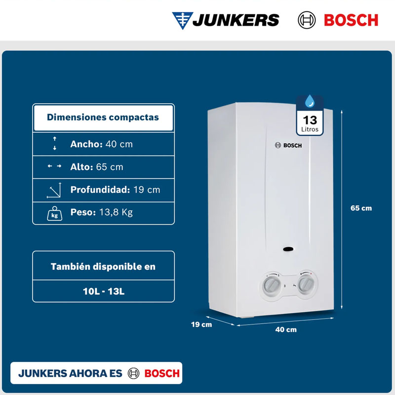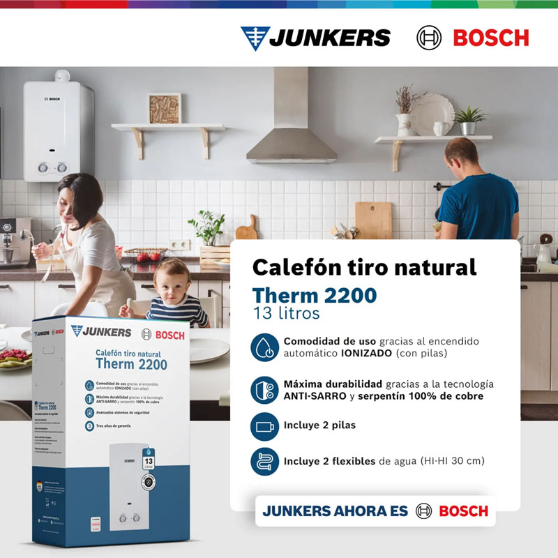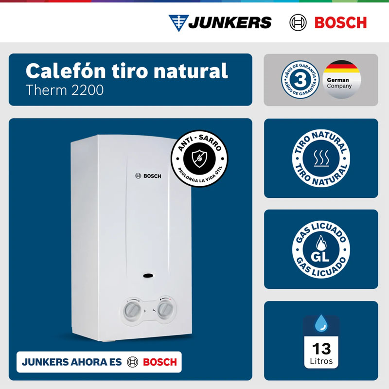 El Calefón Ionizado Bosch Therm 2200 de 13 litros es la solución ideal para disfrutar agua caliente al instante con eficiencia, seguridad y respaldo de calidad alemana. Diseñado para funcionar con Gas Licuado (GL), este equipo ofrece un encendido automático por ionización que elimina la llama piloto permanente, optimizando el consumo de gas y brindando mayor ahorro en el hogar. Su capacidad de 13 litros por minuto permite abastecer cómodamente duchas y lavamanos de manera simultánea, manteniendo una temperatura estable y confortable en todo momento. Compacto, moderno y fácil de instalar, el Therm 2200 combina rendimiento confiable con tecnología segura, convirtiéndose en una excelente opción para el hogar.