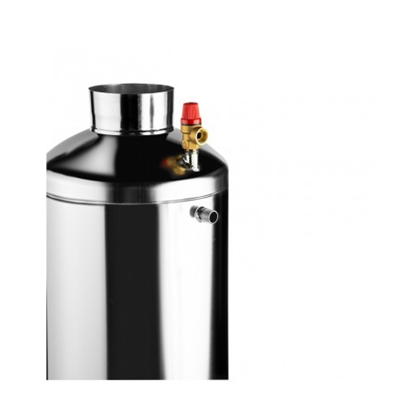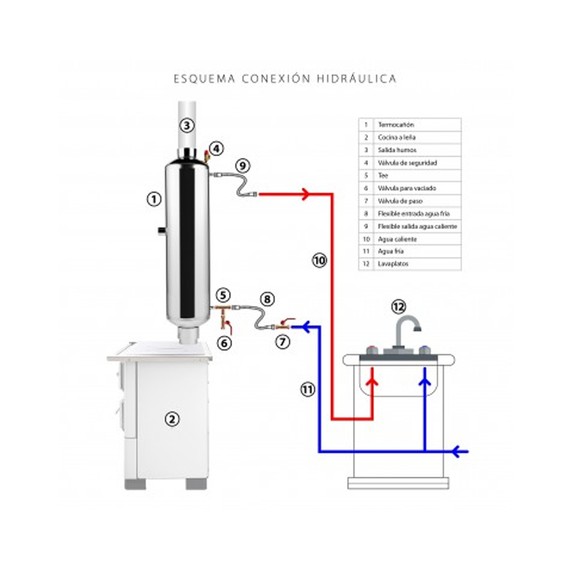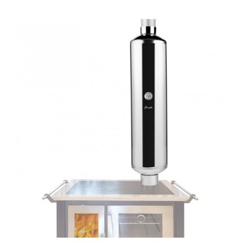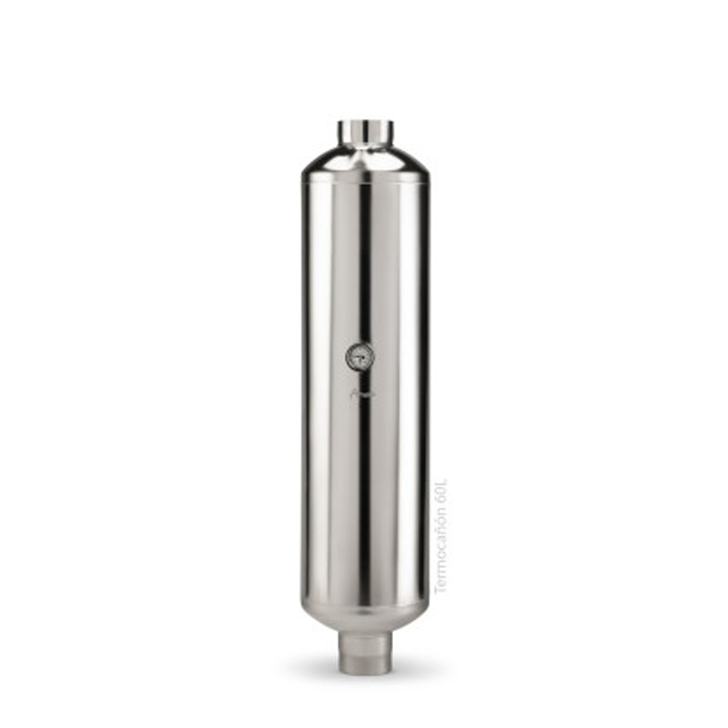 El termocañón Amesti de 60 litros es un accesorio fabricado en acero inoxidable, diseñado para calentar agua aprovechando el calor generado por estufas o cocinas a leña. Se instala directamente en el ducto de evacuación de 5”, permitiendo reutilizar el calor de los gases para una solución eficiente y económica.