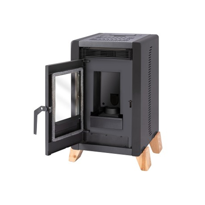Su diseño compacto y elegante en color negro, junto a su vidrio cerámico resistente al calor, permite disfrutar de la vista del fuego, aportando calidez y estilo al ambiente.