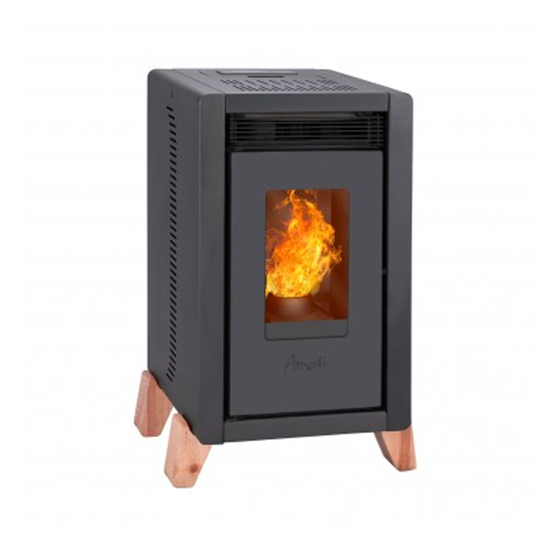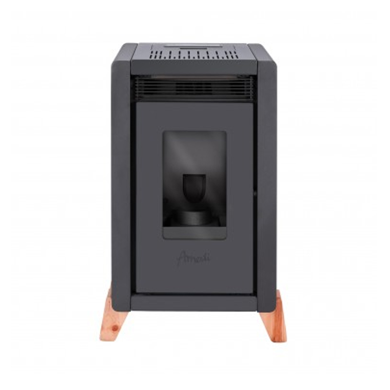 La estufa a pellet Amesti Bambu 6000 negra con kit de instalación muro es un calefactor moderno y eficiente, diseñado para climatizar espacios de hasta 118 m², entregando un calor constante y controlado.