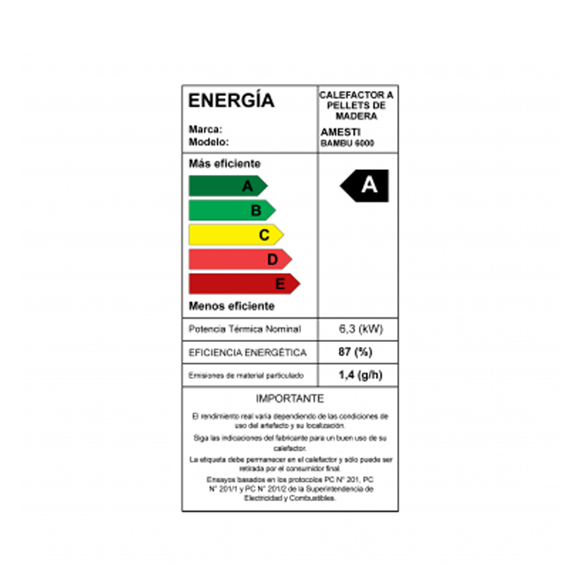 Funciona con pellet (biomasa), un combustible limpio y sustentable, logrando una alta eficiencia energética de hasta 87%, lo que permite optimizar el consumo y reducir costos de calefacción.
