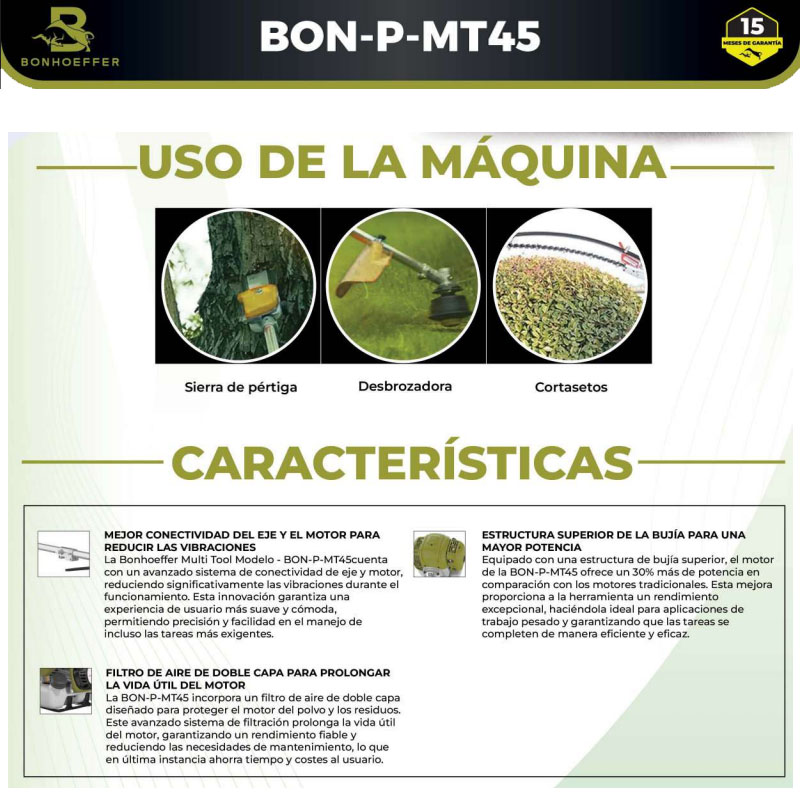 Una herramienta multiuso es esencial para quienes realizan múltiples trabajos de corte, poda y serrado. Diseñada para ser versátil, permite cambiar fácilmente entre distintos accesorios, haciendo que el mantenimiento del jardín, la jardinería y los trabajos profesionales sean más sencillos. Ya sea que necesites podar ramas altas, mantener el césped o dar forma a los setos con precisión, una herramienta multiuso simplifica el trabajo, ahorrando tiempo y esfuerzo. Cuando se trata de herramientas confiables y de alto rendimiento, Bonhoeffer te ofrece lo mejor en durabilidad, potencia y facilidad de uso.