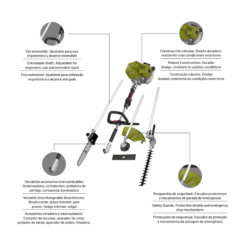 Gracias a su diseño multifuncional 4-en-1, puedes transformar fácilmente la herramienta para distintas labores: desde cortar pasto y bordes, hasta desbrozar áreas más tupidas con accesorios adecuados (como cabezal de nylon o cuchilla metálica). Su estructura resistente y su ergonomía pensada para el uso prolongado te ofrecen comodidad y control excelente en cada pasada.