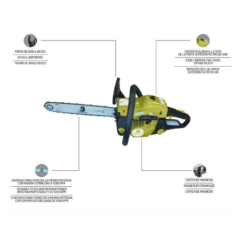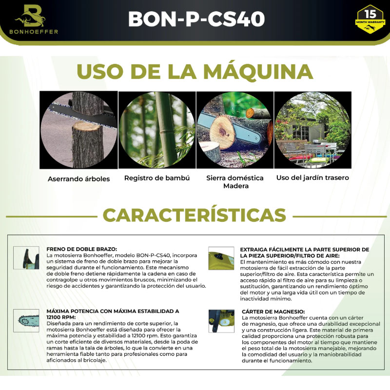 La Bonhoeffer BON-P-CS40 se destaca por su construcción robusta y su desempeño confiable, pensada para acompañar al usuario en tareas exigentes con resultados profesionales. Es una excelente elección para quienes buscan potencia, durabilidad y eficiencia en una motosierra versátil, capaz de responder con solidez a las necesidades de corte más comunes.
