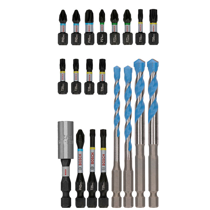 La Bosch PRO Impact Mixed Set 2608521U83 es una sólida y versátil combinación de puntas de atornillar y brocas para perforación que responde a las exigencias de profesionales y aficionados de la industria, mantenimiento y construcción. Diseñada especialmente para atornilladores de impacto y taladros atornilladores, esta selección de accesorios está fabricada con acero modificado tratado térmicamente, lo que le confiere una excelente resistencia al par elevado y mayor durabilidad incluso bajo uso intenso. Los bits cuentan con una zona de torsión extendida que absorbe el estrés generado durante el atornillado, reduciendo la posibilidad de rotura y prolongando su vida útil. Gracias al marcado láser y los anillos codificados por color, identificar rápidamente el tipo de punta adecuado se vuelve intuitivo, agilizando tu trabajo en obra o taller.