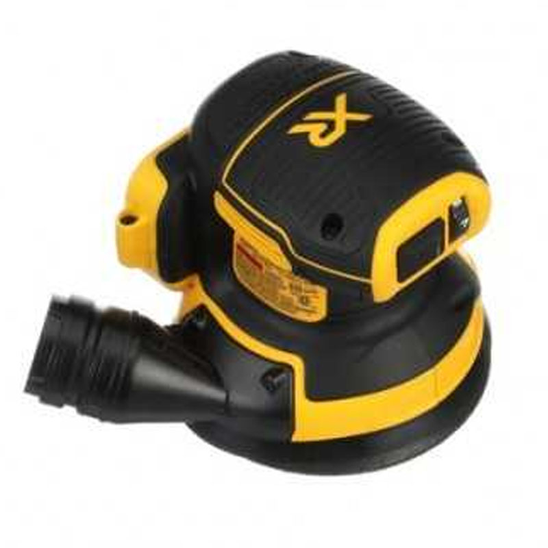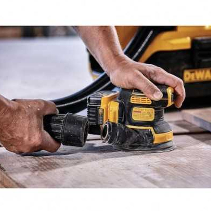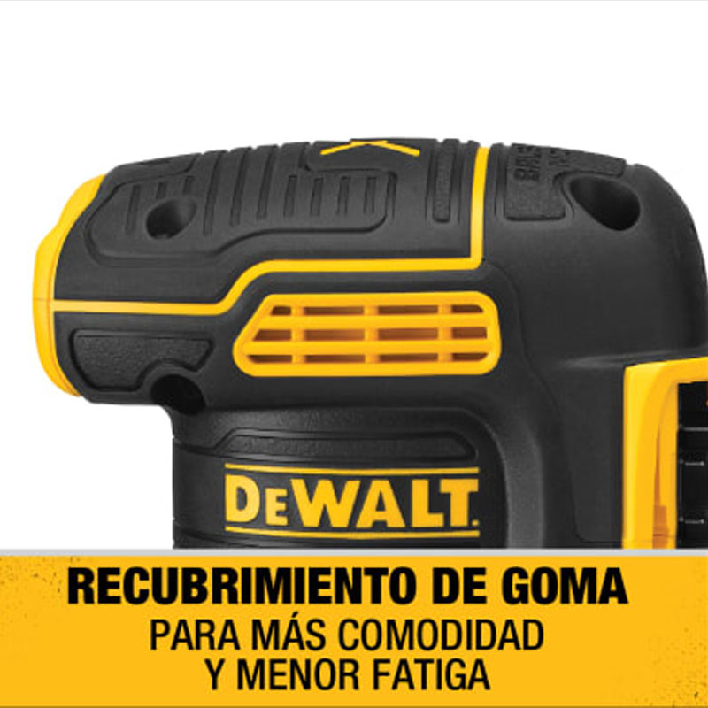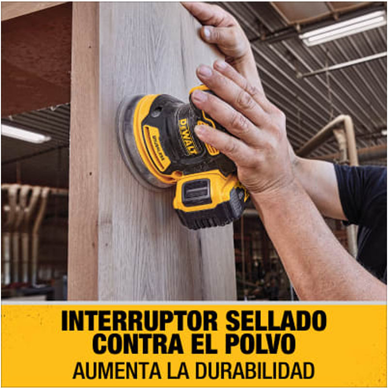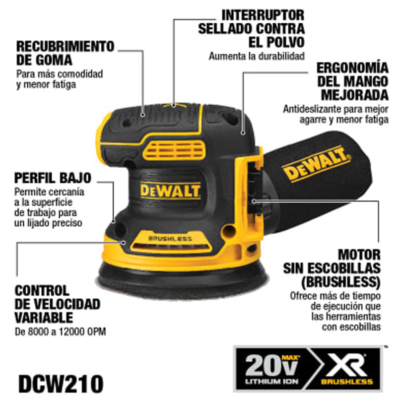 La lijadora roto orbital inalámbrica 20 V MAX XR DEWALT modelo DCW210B es una herramienta compacta, potente y versátil diseñada para acabados finos en madera y superficies diversas sin depender de cableado. Equipada con un motor brushless (sin escobillas) que maximiza la eficiencia y autonomía de la batería, esta lijadora ofrece velocidad variable de 8 000 a 12 000 órbitas por minuto (OPM) para adaptar el rendimiento a diferentes aplicaciones, desde preparación de superficies hasta suavizado de pintura o barniz. Su diámetro de trabajo de 5 pulg (≈ 127 mm) con base de velcro de 8 agujeros permite un cambio rápido y práctico de papeles abrasivos, mientras que el diseño de perfil bajo y mango con recubrimiento de goma proporciona comodidad y control durante la operación. El sistema de recolección de polvo con bolsa integrada ayuda a mantener el área de trabajo más limpia, y la posibilidad de conectar a aspiradores compatibles mejora aún más la captura de residuos. La herramienta se entrega sin batería ni cargador, por lo que es ideal si ya perteneces al ecosistema 20 V MAX de DEWALT