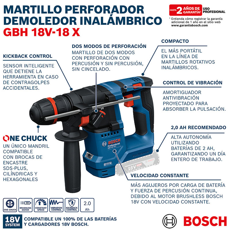 El Martillo Perforador Inalámbrico GBH 18V-148X BOSCH Mod. 06119271E0 es una herramienta profesional diseñada para ofrecer máxima potencia, control y eficiencia en trabajos de perforación y cincelado ligero. Desarrollado por Bosch, este equipo combina tecnología avanzada con un diseño robusto y ergonómico, ideal para trabajos en hormigón, mampostería y otros materiales de alta resistencia. Su sistema inalámbrico de 18V brinda total libertad de movimiento en obra, mientras que su motor de alto rendimiento asegura perforaciones rápidas y precisas con menor vibración. Es la opción perfecta para profesionales de la construcción, instaladores y técnicos que requieren desempeño confiable y duradero en cada proyecto.