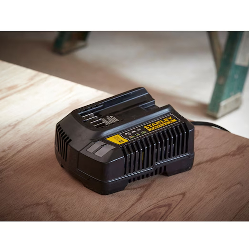 Cargador de batería Stanley modelo SC400-B2, diseñado para cargar baterías del sistema 20V V20 de forma rápida, segura y eficiente. Es ideal para usuarios que trabajan con herramientas inalámbricas Stanley, asegurando continuidad en el trabajo.
